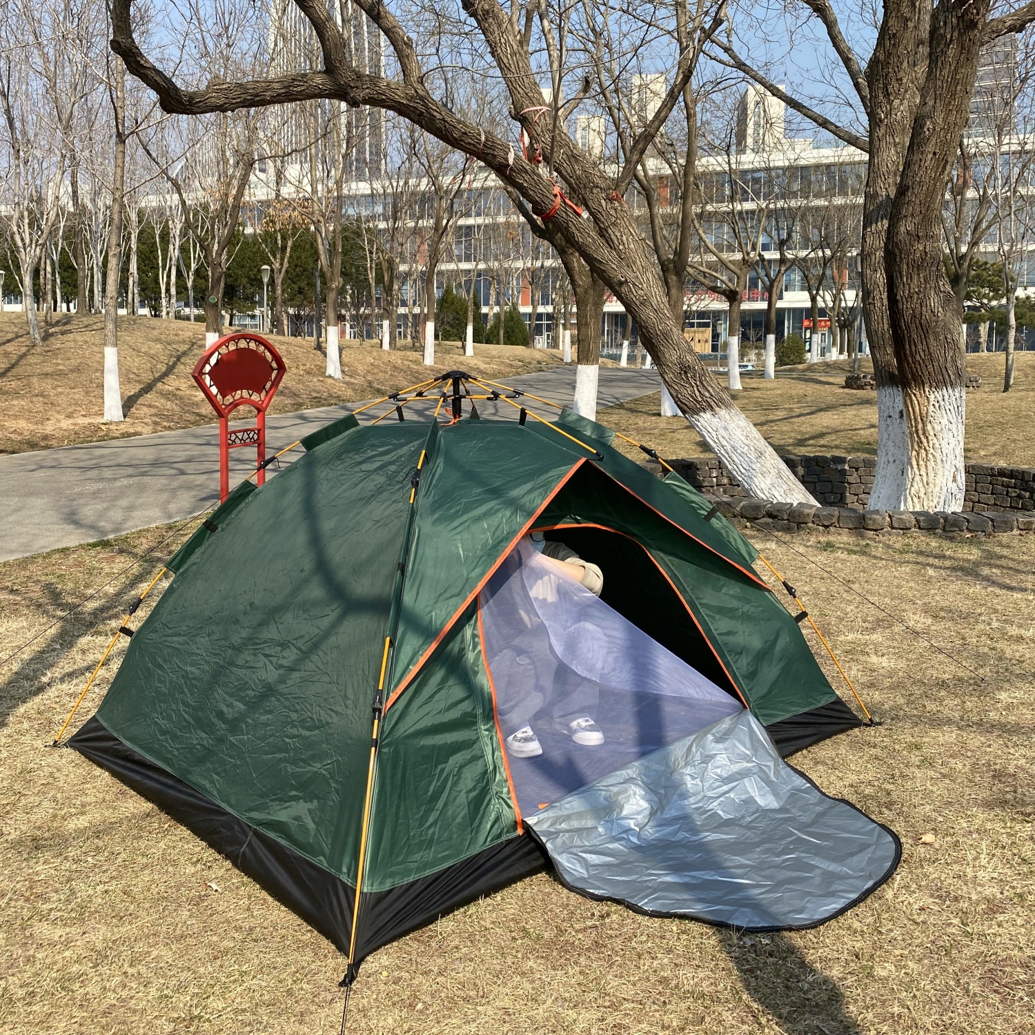 Functional Door Canopy: The front door can be extended into a small canopy using the collapsible poles (included), creating a shaded space for relaxing. (As seen in image_100.png).